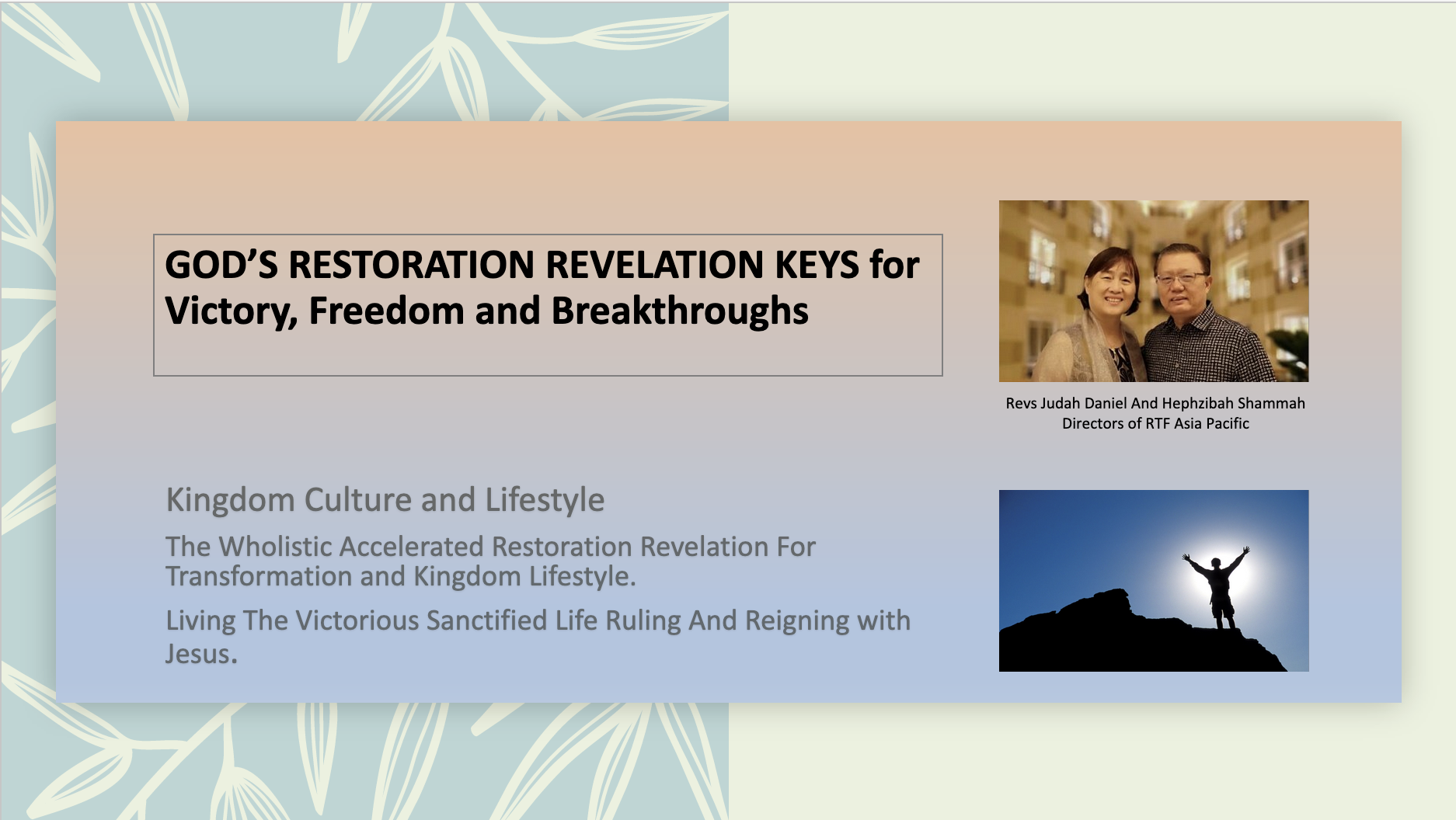 We RTF Asia Pacific would like to state that all sharing, teaching, and all course contents are based on Biblical Principles and the revelations, counsel and guidance of the Holy Spirit. As such those who sign up for these courses to overcome their issues and needs are depending on God for His divine help and restoration. Although we always receive positive testimonies, we can not guarantee any healing to anyone going through these courses, due to many other factors.